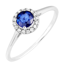 Inel Aur alb 18 carate - Safir albastru rotund 0.5 carate - Halo Diamant