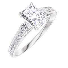 Descoperiți eleganța simplă a acestui inel solitar cu umeri, realizat din aur alb de 18 karate. Diamantul de laborator dreptunghiular de 0,5 carate este însoțit de 21 diamante laterale care adaugă o strălucire subtilă și rafinată.