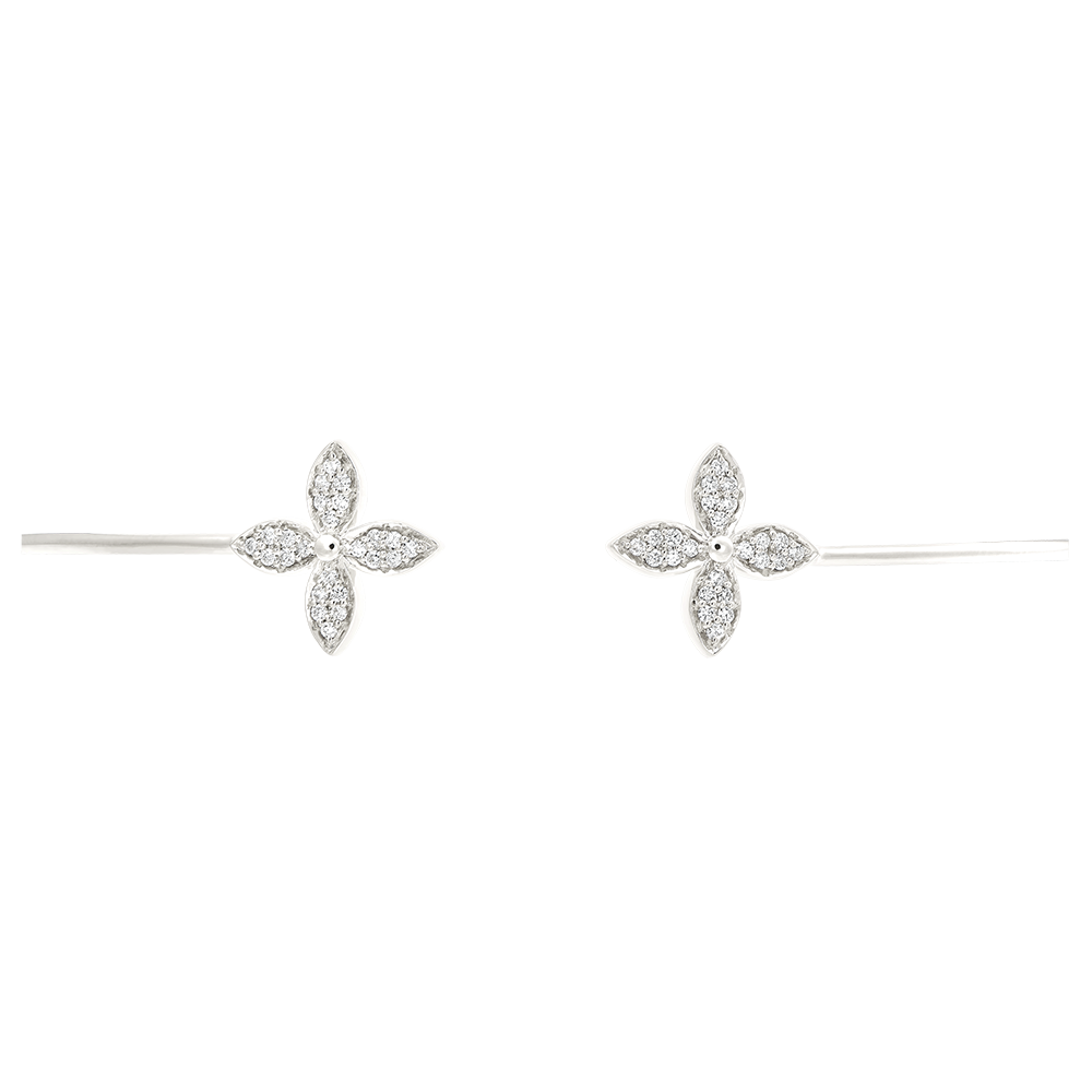 O brățară elegantă din aur alb închisă de doi trifoi incrustați cu diamante strălucitoare. Un talisman blând, care doar ce a înflorit.