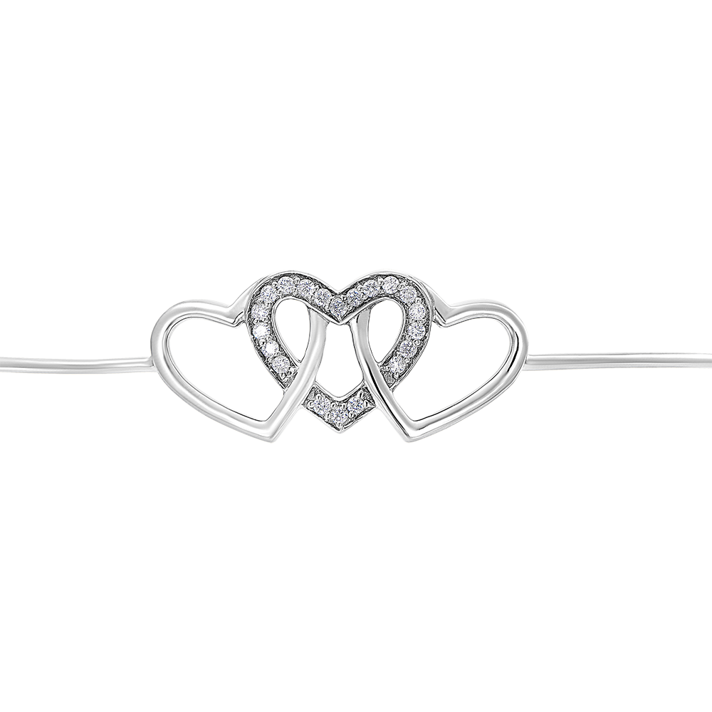 O brățară fixă cu trei inimi cu învălurări tandre și pătimașe ce îmbină cu delicatețe aurul alb și diamantele. Brățară cu lanț tip fermoar pentru confort suplimentar.