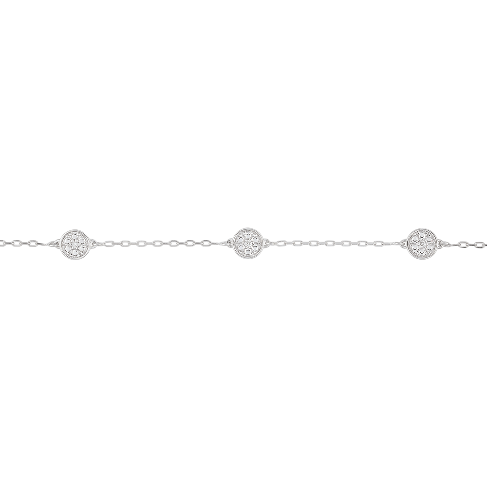 Patru motive din aur alb lucrat stil diamant dau diamantelor centrale întreaga lor strălucire asemeni stelelor. O brăţară Miriadă elegantă şi feminină.Brăţară cu lungime reglabilă: 18cm, 17cm, 16cm.Motiv de 5mm lungime şi 5mm înălţime.