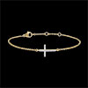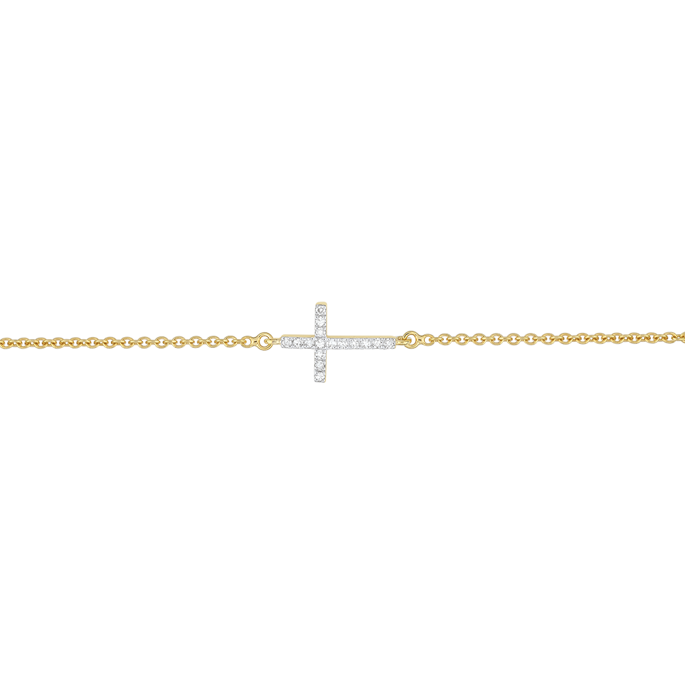O brăţară cruce din nelipsitul aur galben, cu proporţii fine şi delicate, este subliniată de un pavaj de diamante minuţios montate pe lănţişor. Lungimea motivului: 11.5mm, înălţimea motivului: 8mm. Brăţară cu lungime reglabilă: 18cm, 17cm, 16cm