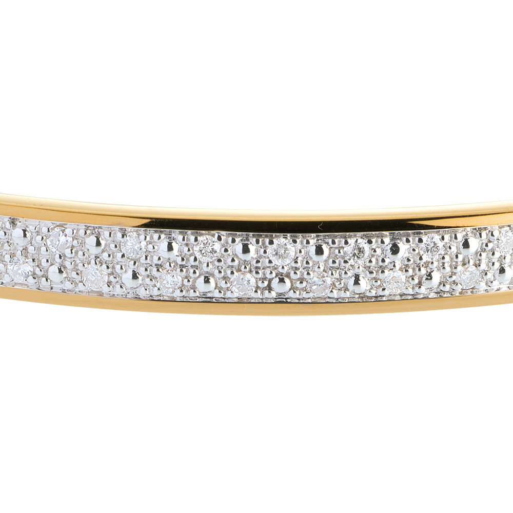 Strălucirea irizată a unui pavaj minuţios şi rafinat cu diamante într-o brăţară fixă, delicată.