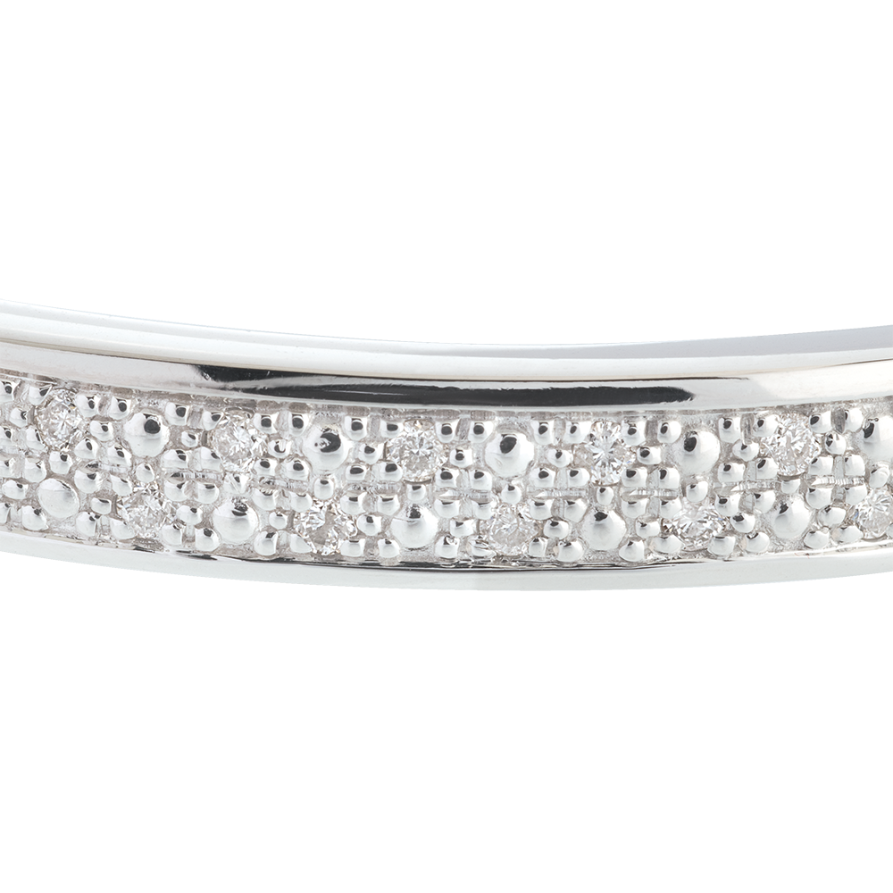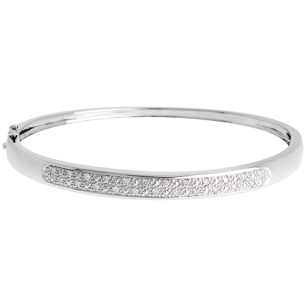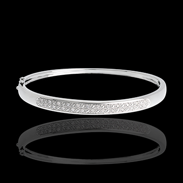 Strălucirea irizată a unui pavaj minuţios şi rafinat cu diamante într-o brăţară fixă, delicată.