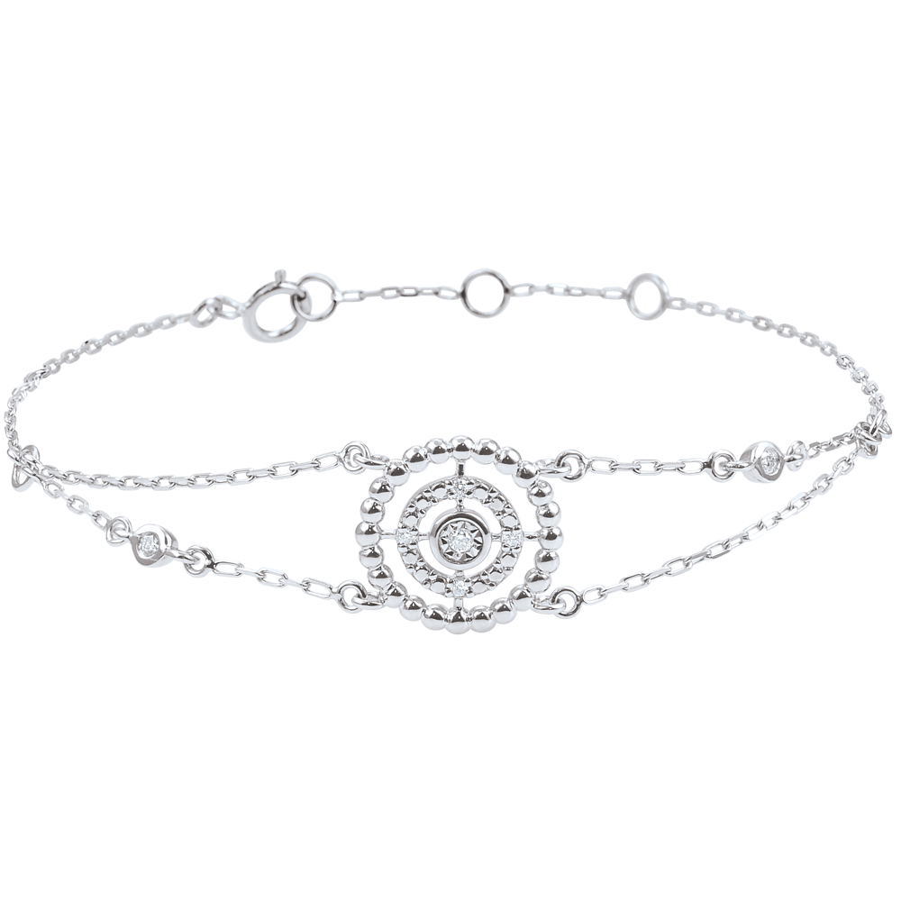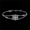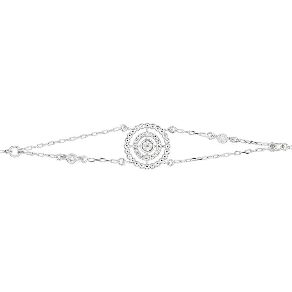 Un cerc de perle de aur înconjoară un cerc de diamante şi un solitaire în centru. Această bijuterie este fixată pe un lanţ încrustat cu două diamante. Brăţară cu lungime reglabilă: 18cm, 17cm, 16cm. Motiv de 11 mm lungime şi 11 mm înălţime.