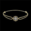 Un cerc de perle de aur înconjoară un cerc de diamante şi un solitaire în centru. Motivul este fixat pe un cordon bej modern.
