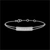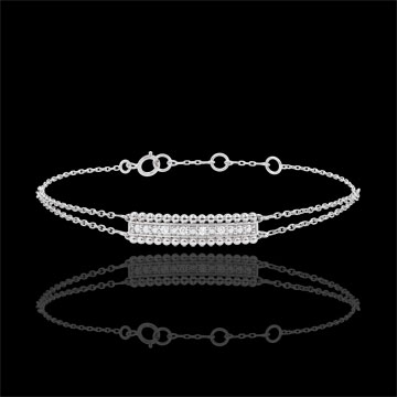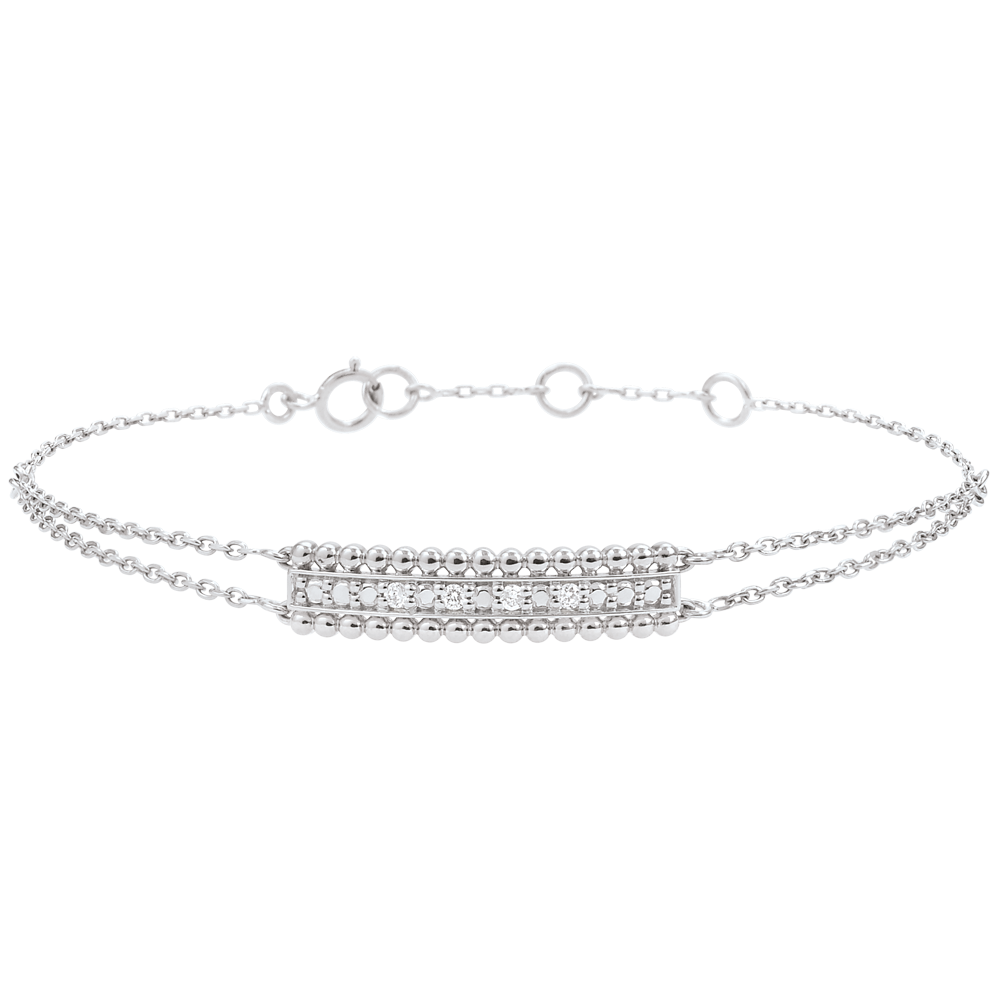 Două şiruri de perle de aur alb încadrează un pavaj înălţat de aur şi diamante. Motivul este pus în valoare de două lănţişoare ce se contopesc într-unul singur. Brăţară cu lungime reglabilă: 18cm, 17cm, 16cm. Motiv de 21mm lungime şi 5mm înălţime.