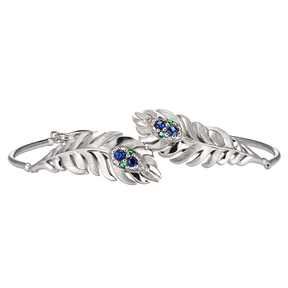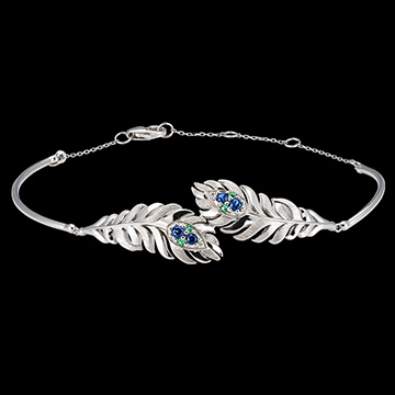 Brățara Signature din aur alb de 9 carate prezintă un motiv elegant de pană împodobit cu 8 smaralde și safire sintetice. Designul său lucrat cu minuțiozitate, încastrat cu pietre, se închide cu o încuietoare discretă. O piesă care surprinde esența aeriană și rafinamentul de neegalat ale penelor, semnătura colecției Panache.