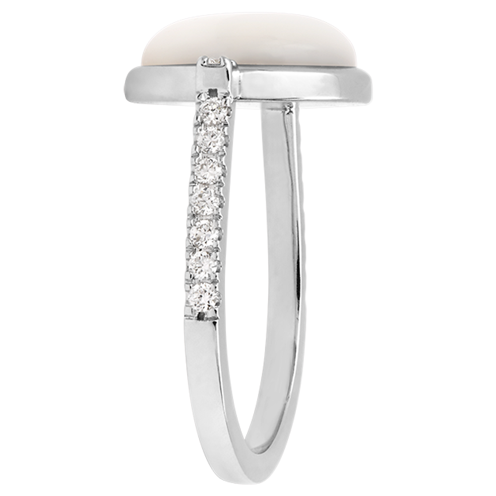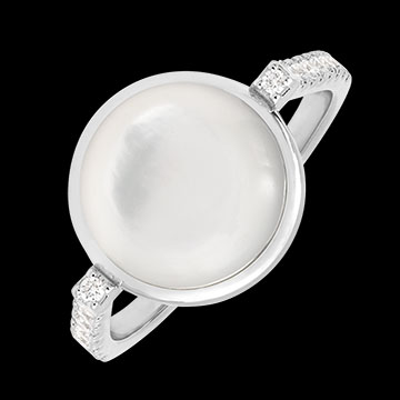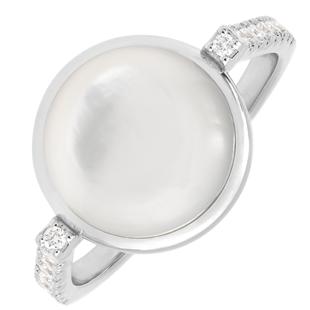 Elegant și luminos, inelul Cabochon Aura Nacrée combină finețea unui cabochon din sidef alb cu strălucirea diamantelor montate în aur. Designul său simplu evidențiază piatra centrală, adăugând o notă modernă și rafinată. Se poartă singur sau împreună cu verighetele Contour – netede sau cu diamante – pentru a crea trio-ul Romance Moderne, o îmbinare perfectă între minimalism și feminitate.