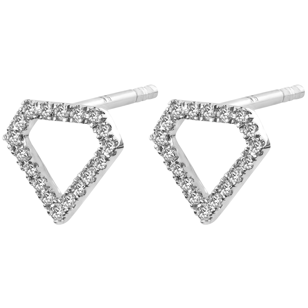 O pereche de cercei grafică şi minimalistă, cu contururi pavate care celebrează silueta unui diamant.
