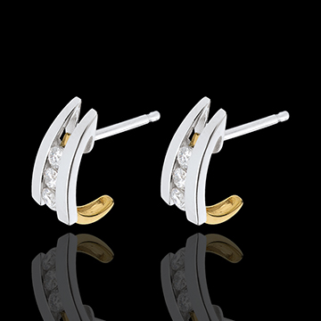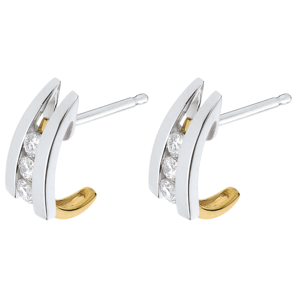 cercei în două nuanţe de aur cu trilogie de diamante sub formă de gheruţe pentru a se agăţa de iubire.
