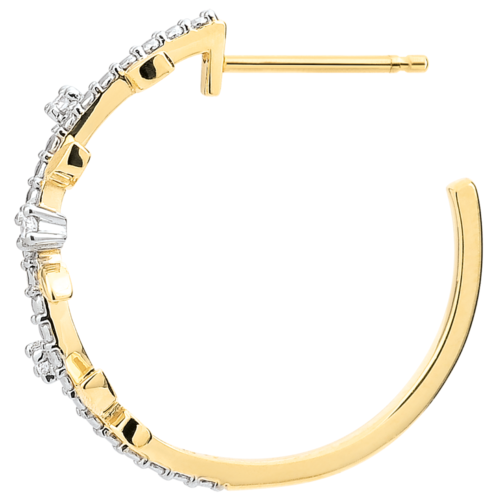O alternanţă de frunze de aur galben strălucitoare şi de frunze cu lustru periat manual pentru creole romantice încrustate cu 6 diamante.