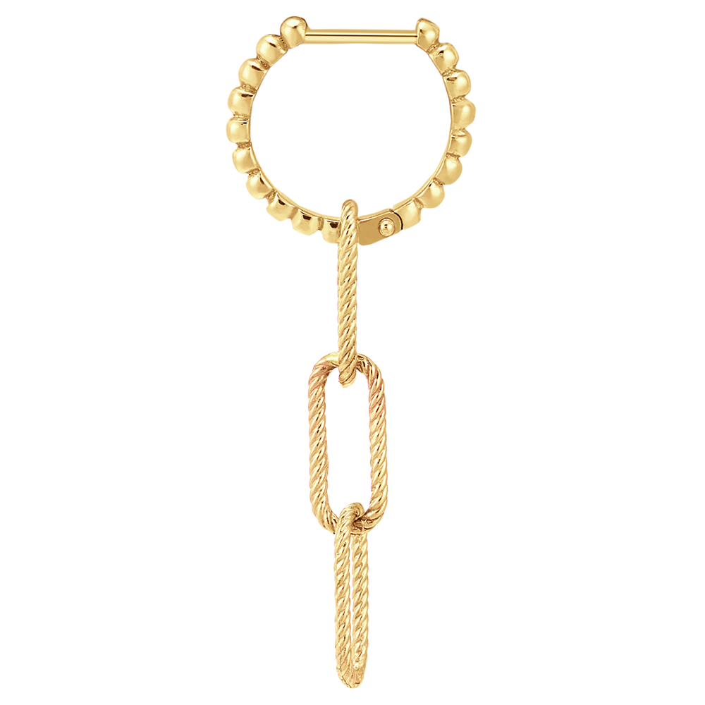 Un trio de zale din aur galben ușor răsucite ce se leagănă pe un inel din aur perlat. O pereche de cercei lungi, moderni, cu un aer rock.