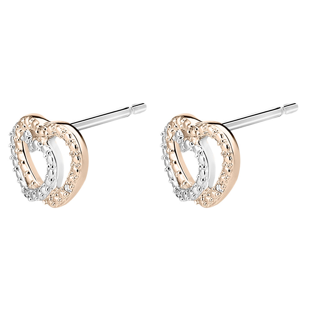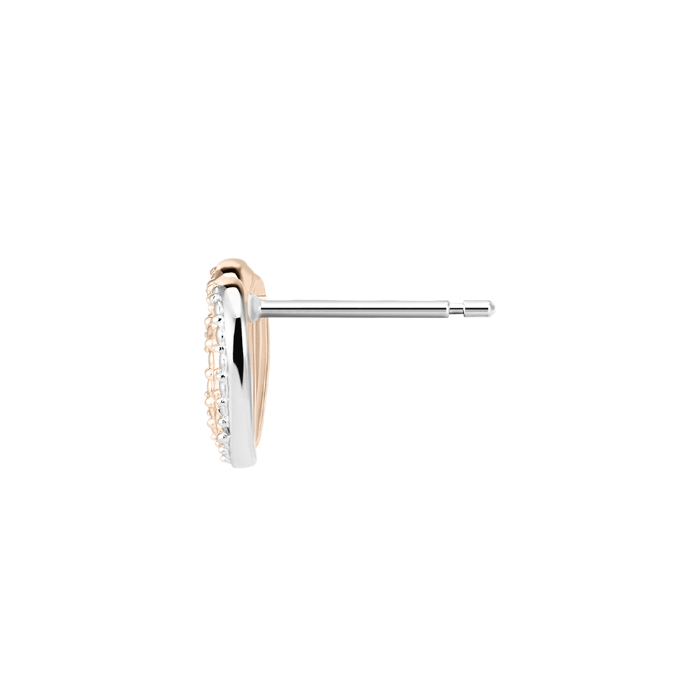 Această pereche de cercei, două inimioare din aur alb și aur roz lucrate asemeni diamantelor și încrustate cu diamante, inspiră tandrețe și complicitate.