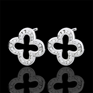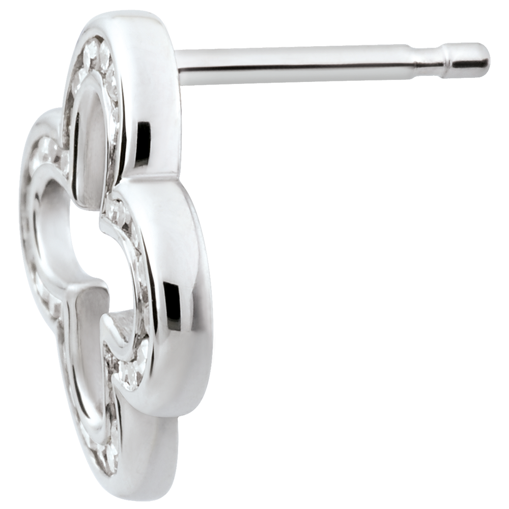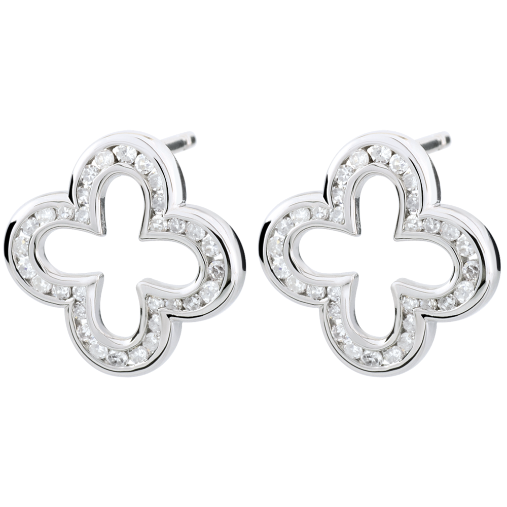 Două trifoiuri cu 4 foi stilizate şi bogat pavate cu diamante pentru cea mai frumoasă strălucire.