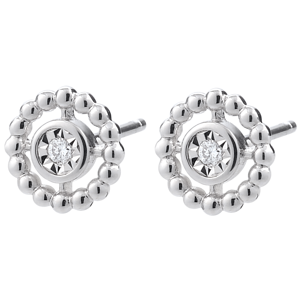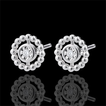 Un cerc de perle de aur alb înconjoară un diamant solitaire în centrul său.