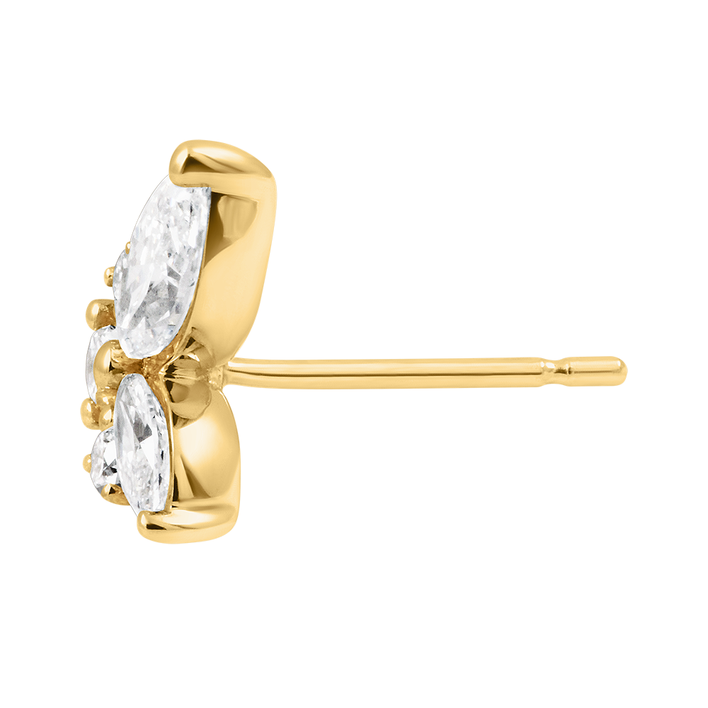 Cerceii "Fluture de la Miezul Nopții" din aur galben 9 carate sunt împodobiți cu zece diamante sintetice tăiate marquise și rotund, aranjate în formă de fluture delicat.