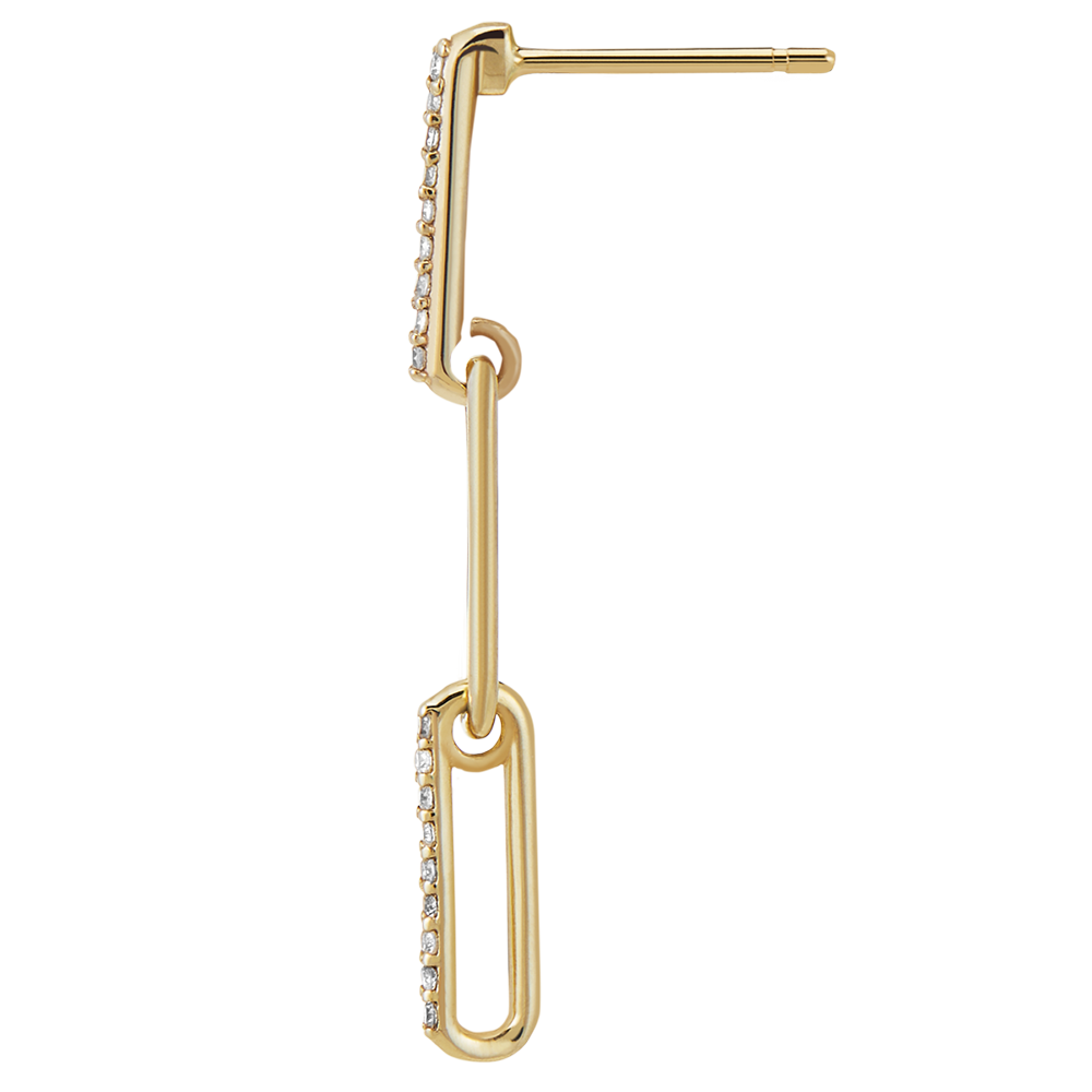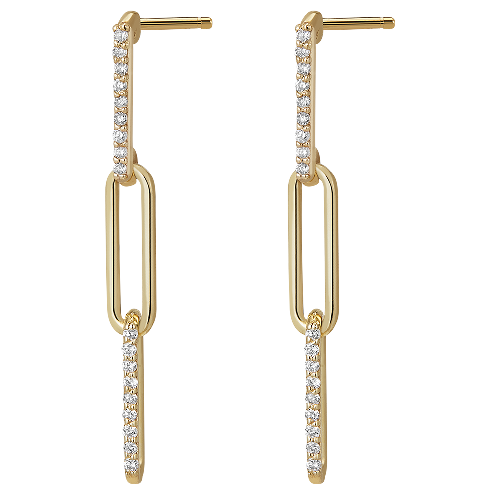 Un trio de zale din aur galben delicat încrustate cu diamante se leagănă cu eleganță. O pereche de cercei lungi, moderni și feminini
