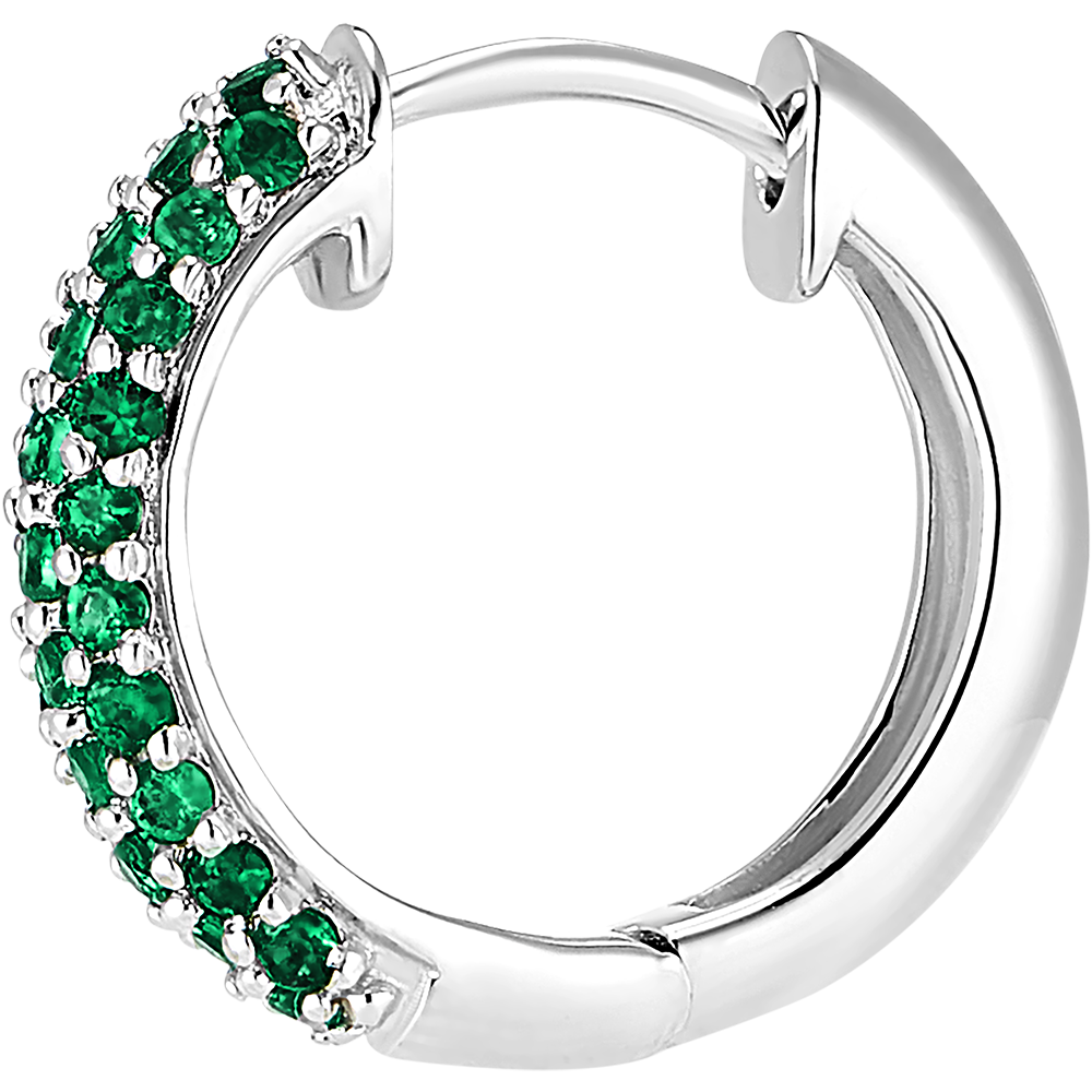 O pereche de creole din aur alb încrustate pe trei rânduri cu 62 de smaralde delicate. O bijuterie clasică și atemporală în același timp ce adaugă o notă de culoare.