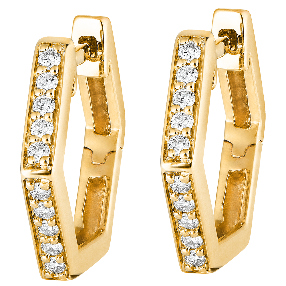 O pereche de creole hexagonale din aur galben setate cu diamante delicate pentru un efect grafic și modern în același timp. Bijuterie cu o personalitate puternică.