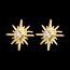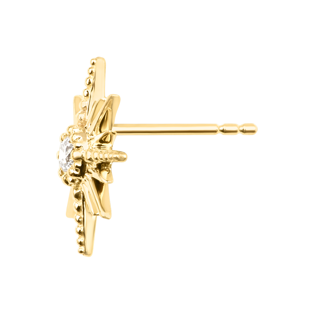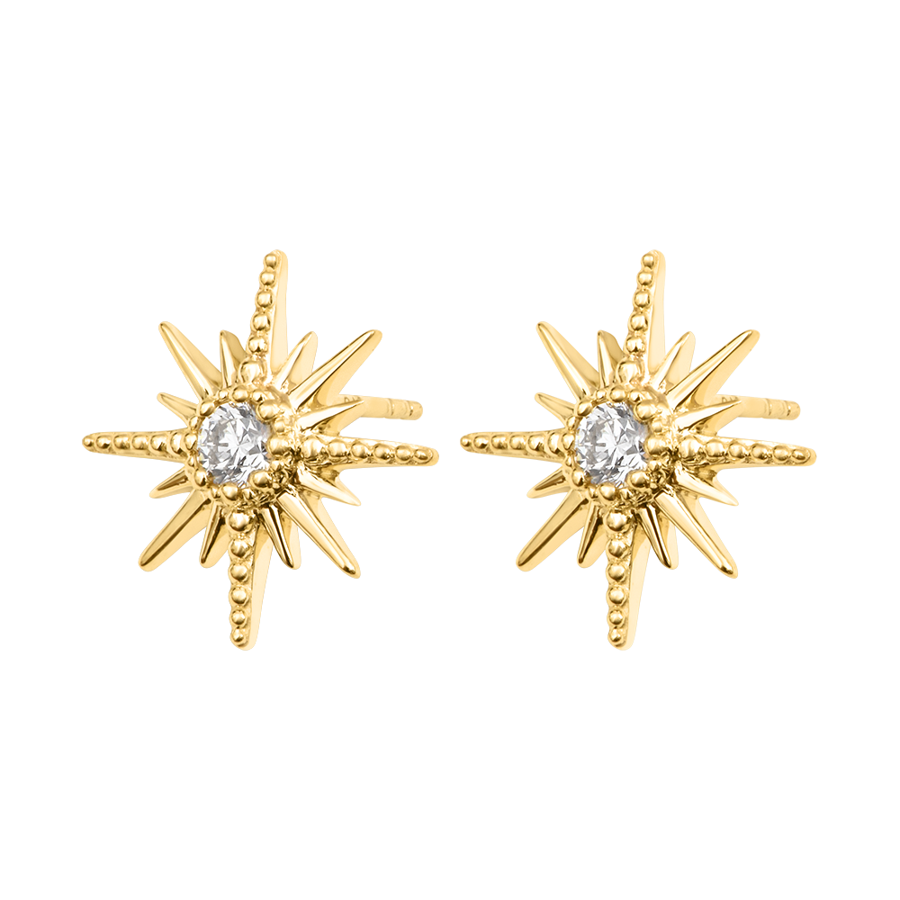 Acești cercei tip buton prezintă un motiv de stea radiantă decorat cu două diamante sintetice tăiate rotund, în total 0,2 carate. Realizați din aur galben de 9 carate, adaugă o notă solară și grafică stilului tău zilnic.