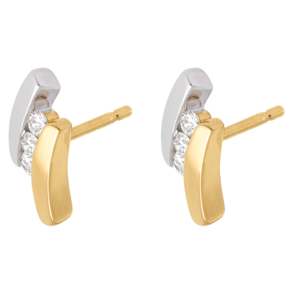 O trilogie între ghilimele din aur galben- aur alb, într-o pereche de cercei cu şurub delicaţi şi spontani.