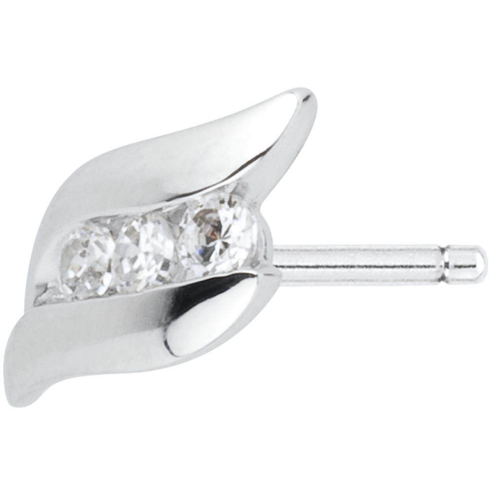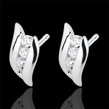 o trilogie de diamante prinsă în mişcarea vălurită a aurului alb din fiecare cercel.