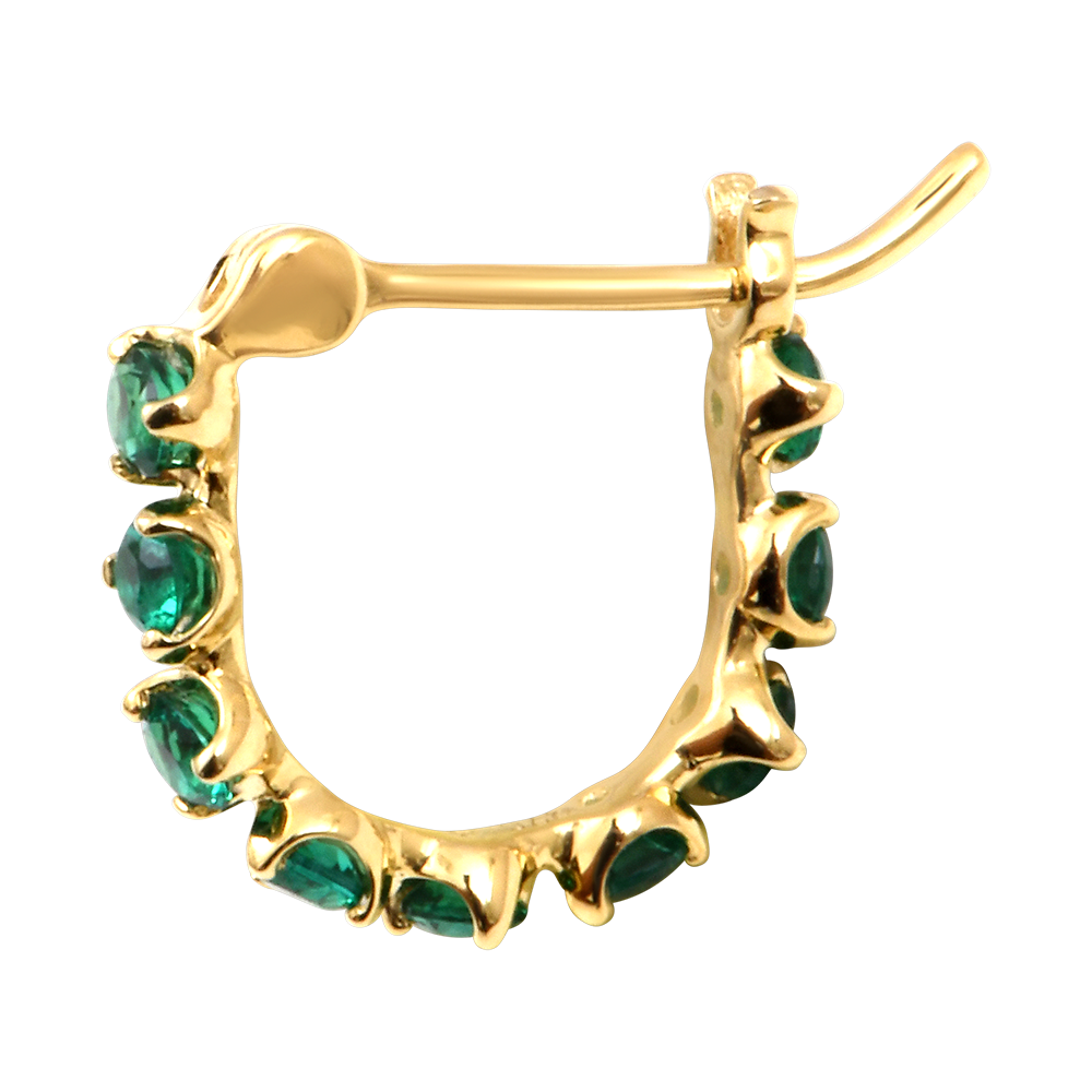 Acești cercei creolă din aur galben 9 carate sunt împodobiți cu un pavé de smaralde sintetice ce oferă o strălucire verde vibrantă. Adaugă o notă prețioasă și naturală ținutei tale.