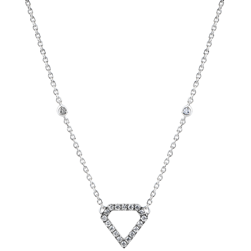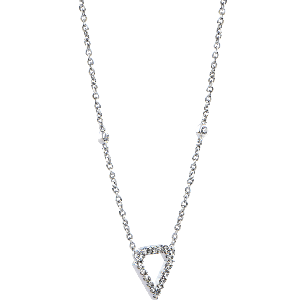 Un colier grafic şi minimalist, cu contururi pavate care celebrează silueta unui diamant. Lanţ din aur alb ornat cu diamante setate bezel.