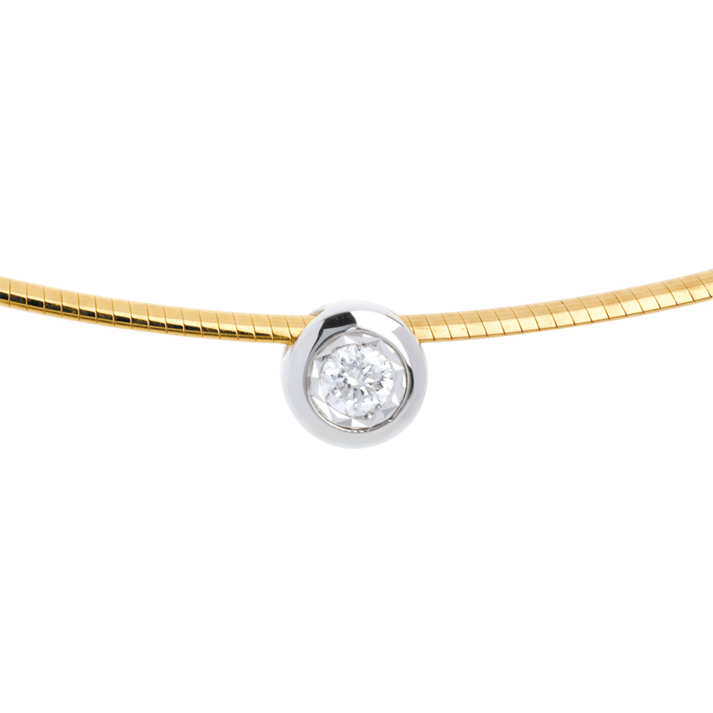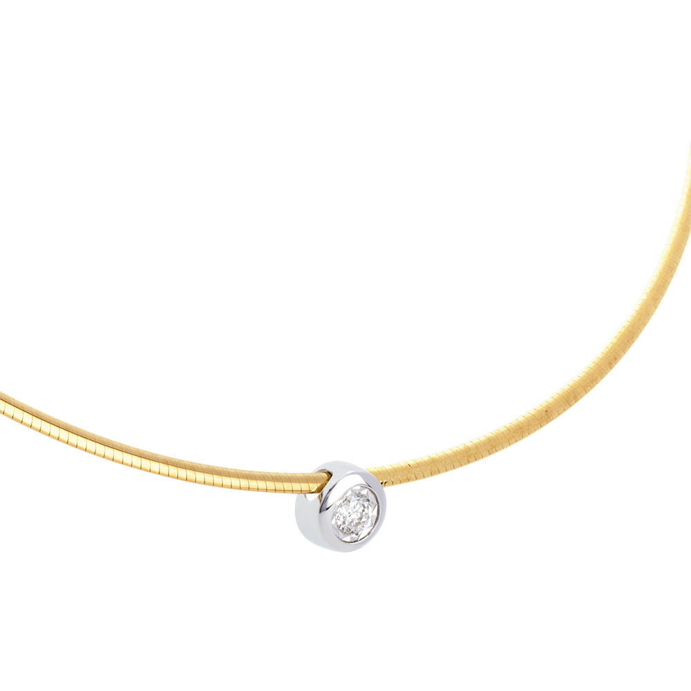 Un colier rigid încoronat de un diamant, creând un aspect delicat şi contemporan.
