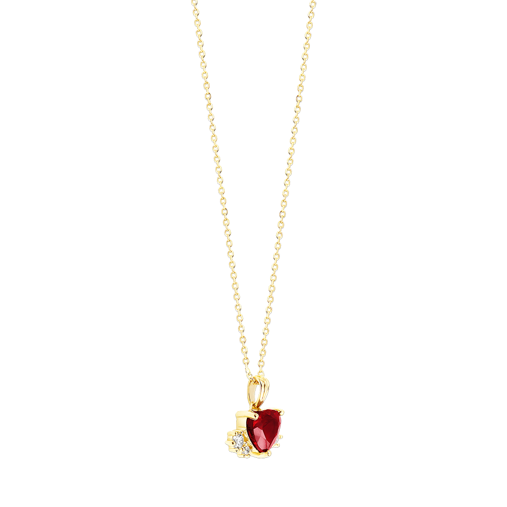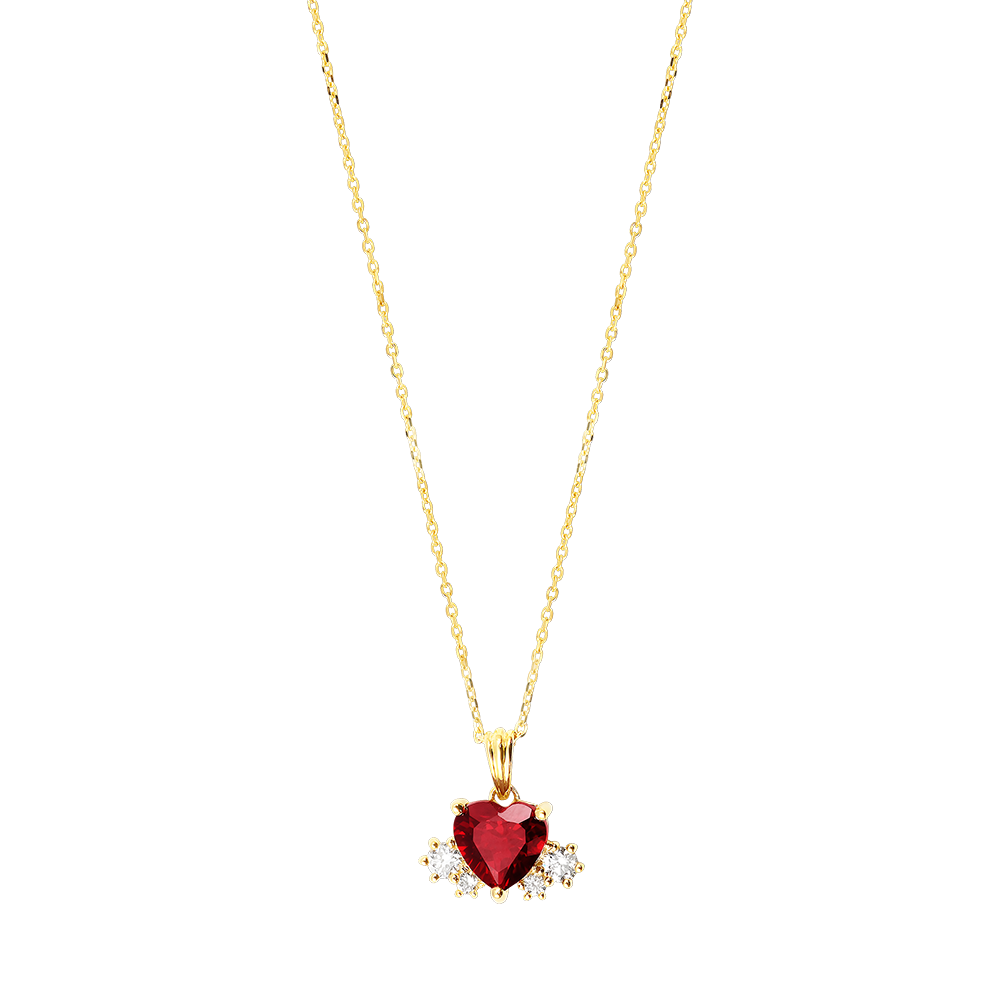Acest colier din aur galben 9 carate prezintă un rubin sintetic în formă de inimă, de un roșu intens, înconjurat de patru diamante sintetice strălucitoare.