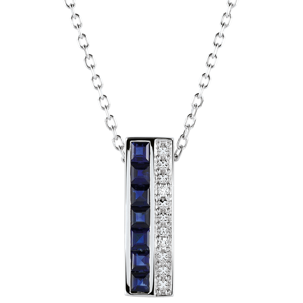 Un colier elegant din aur alb al cărui pavaj central de safire albastre este subliniat de un şir de diamante şi flori de aur.
