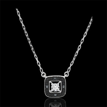 Minunat Colier Clar Obscur pătrat din aur alb structurat în jurul unui diamant alb şi însoţit de diamante negre pentru un look şic şi modern.