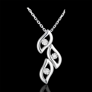 Trei flăcări din aur alb şi diamante dansează la capătul unui lanţ cu zale împletite.