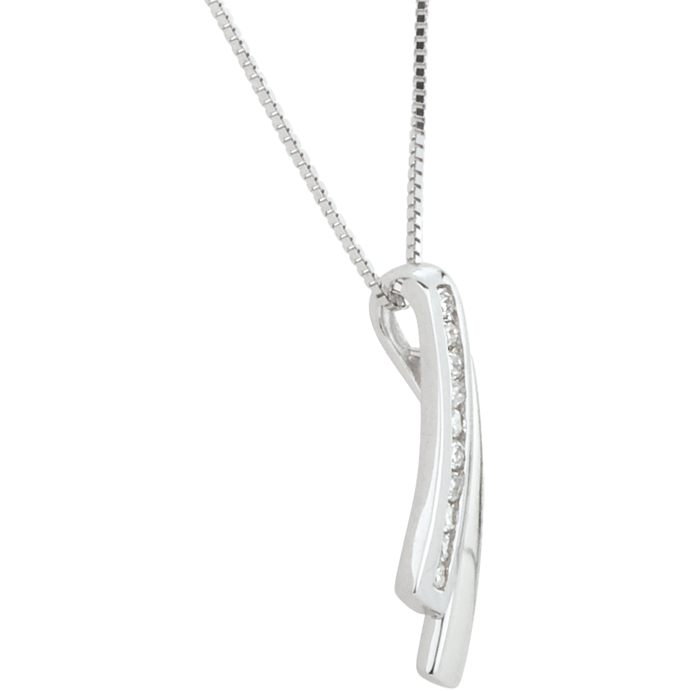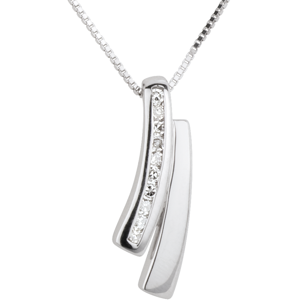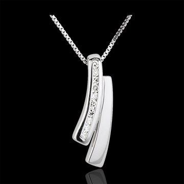 Suspendată de un lanţ veneţian din aur alb sclipitor se află o bandă de aur alb pavată cu diamante.