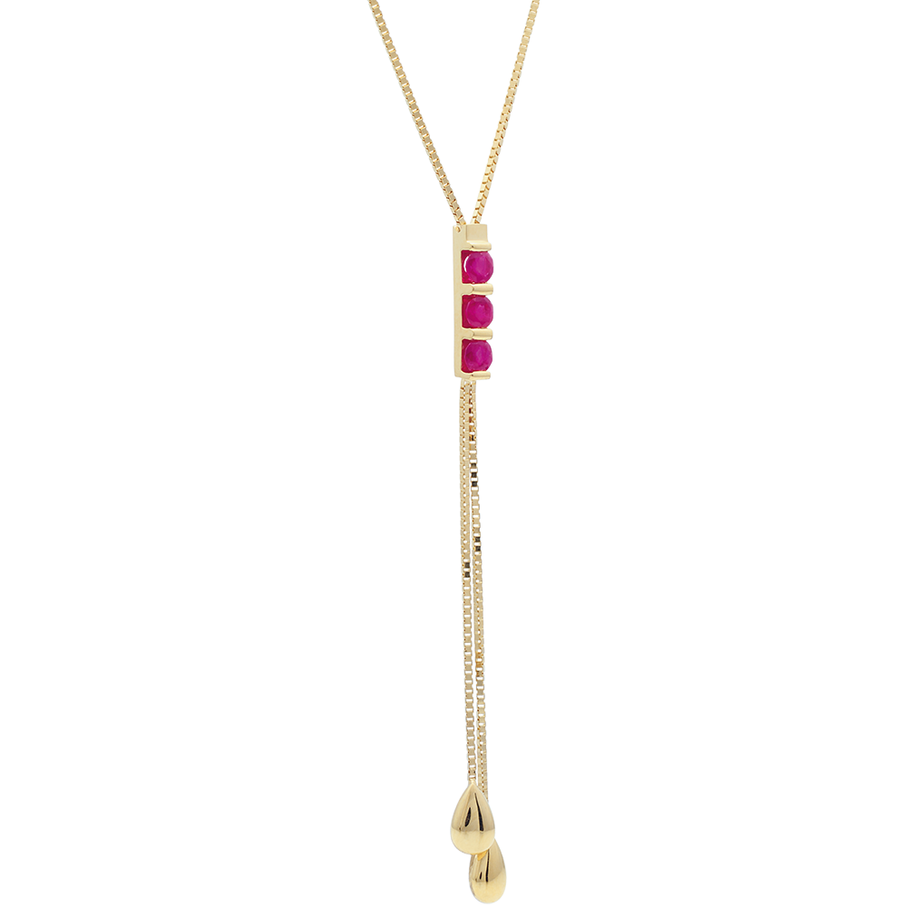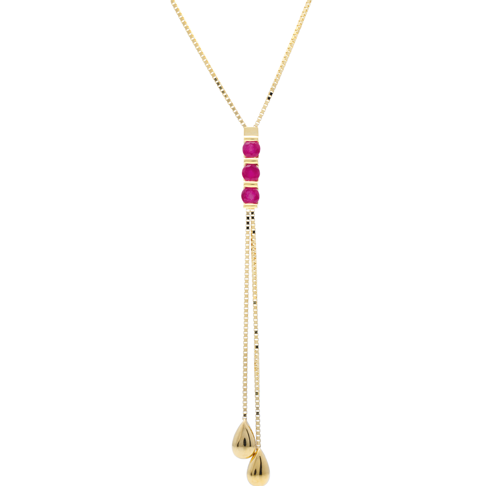 Două picături de aur sunt suspendate de braţele unei trilogii de rubine. Zale lanţ veneţian.