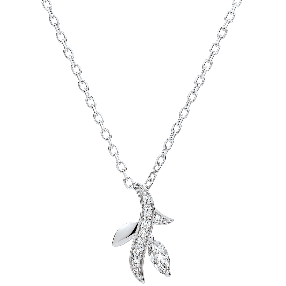O ramură strălucitoare îngheţată în etern. Frunza sa preţioasă, diamant tăiat marquise, este subliniată de aurul alb încrustat cu briliante ce îi serveşte drept sipet.