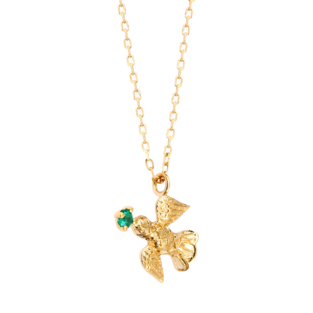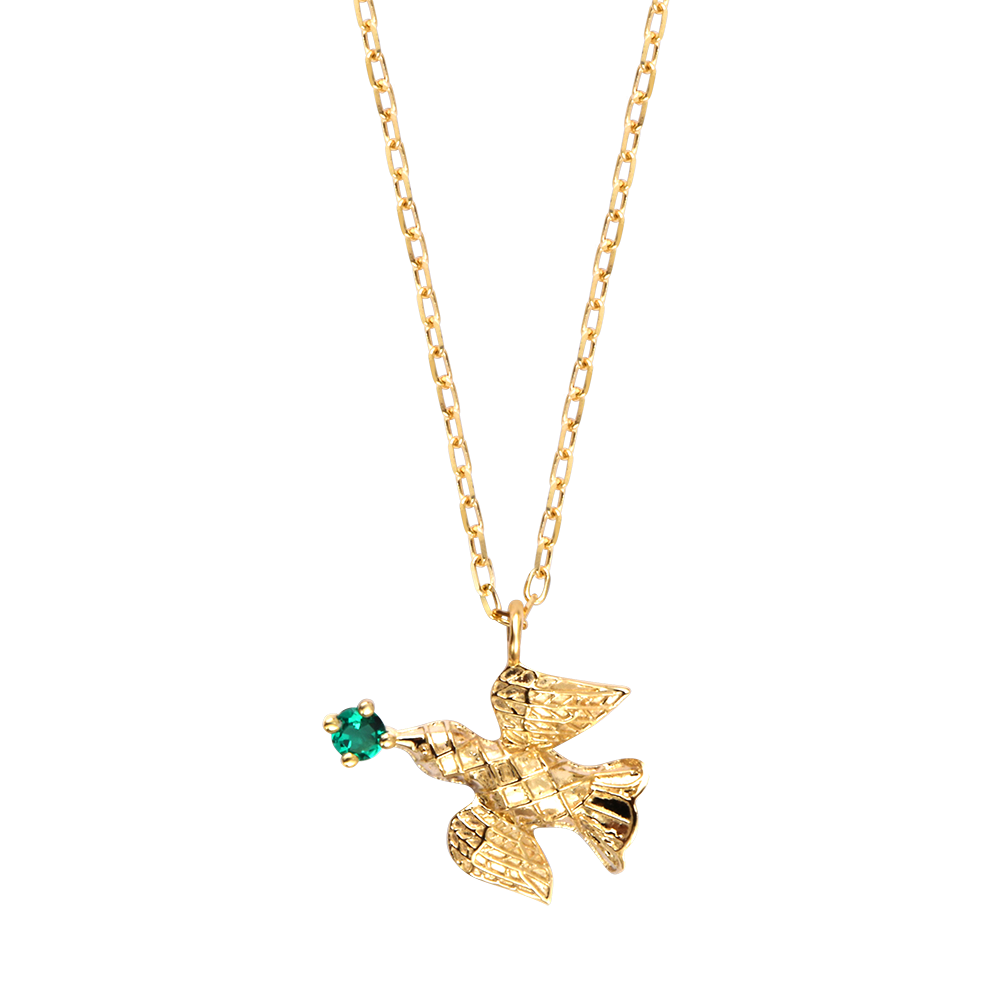 Acest colier delicat prezintă un porumbel fin sculptat care ține un smarald sintetic strălucitor, simbol al păcii și speranței.