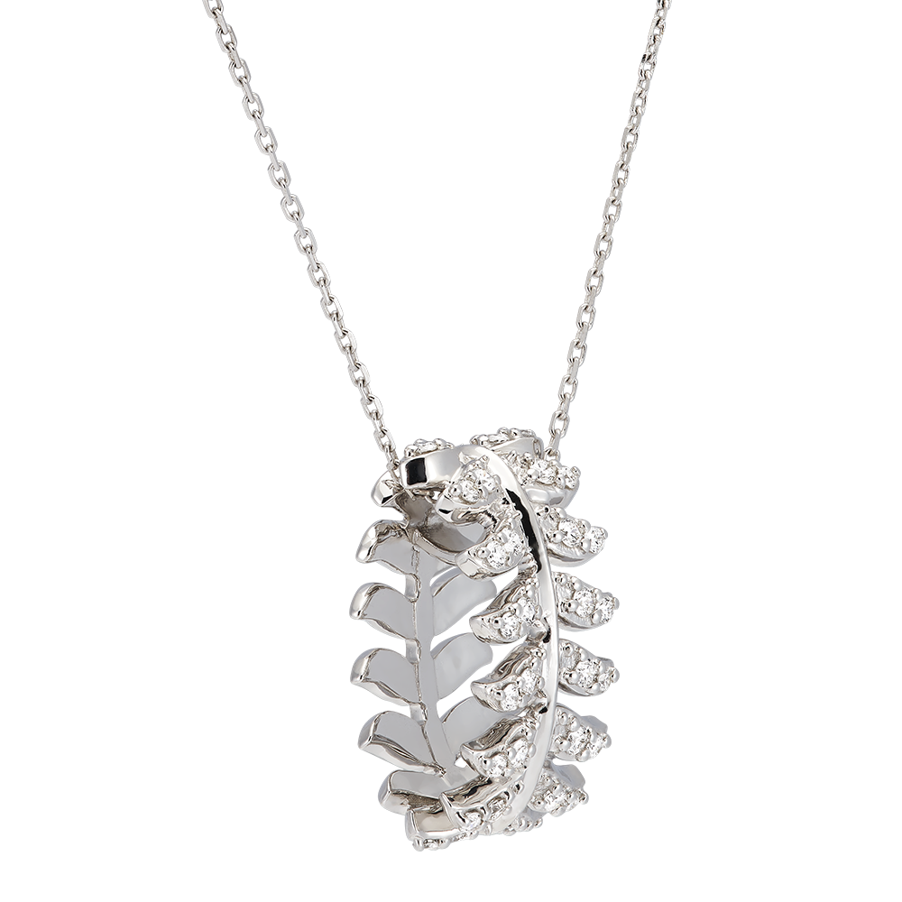 Colierul Révérence, realizat din aur alb de 18 carate, se remarcă prin motivul său circular de pană, delicat încrustat cu 32 de diamante sintetice de calitate GVS1.