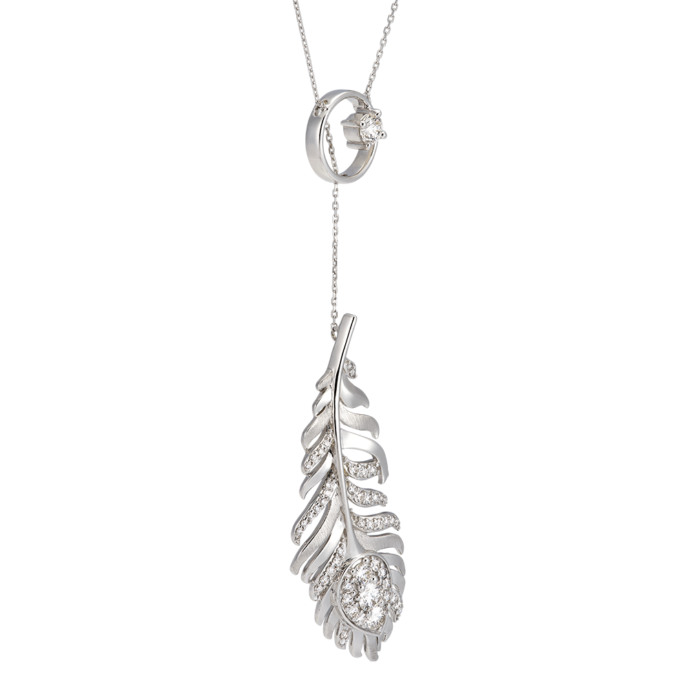 Colierul Sautoir este realizat din aur alb de 9 carate și împodobit cu 50 de diamante sintetice care îi pun în valoare pandantivul în formă de pană. Lanțul său de 45 cm și designul sofisticat adaugă o alură maiestuoasă care reflectă perfect spiritul spectaculos al colecției Panache.