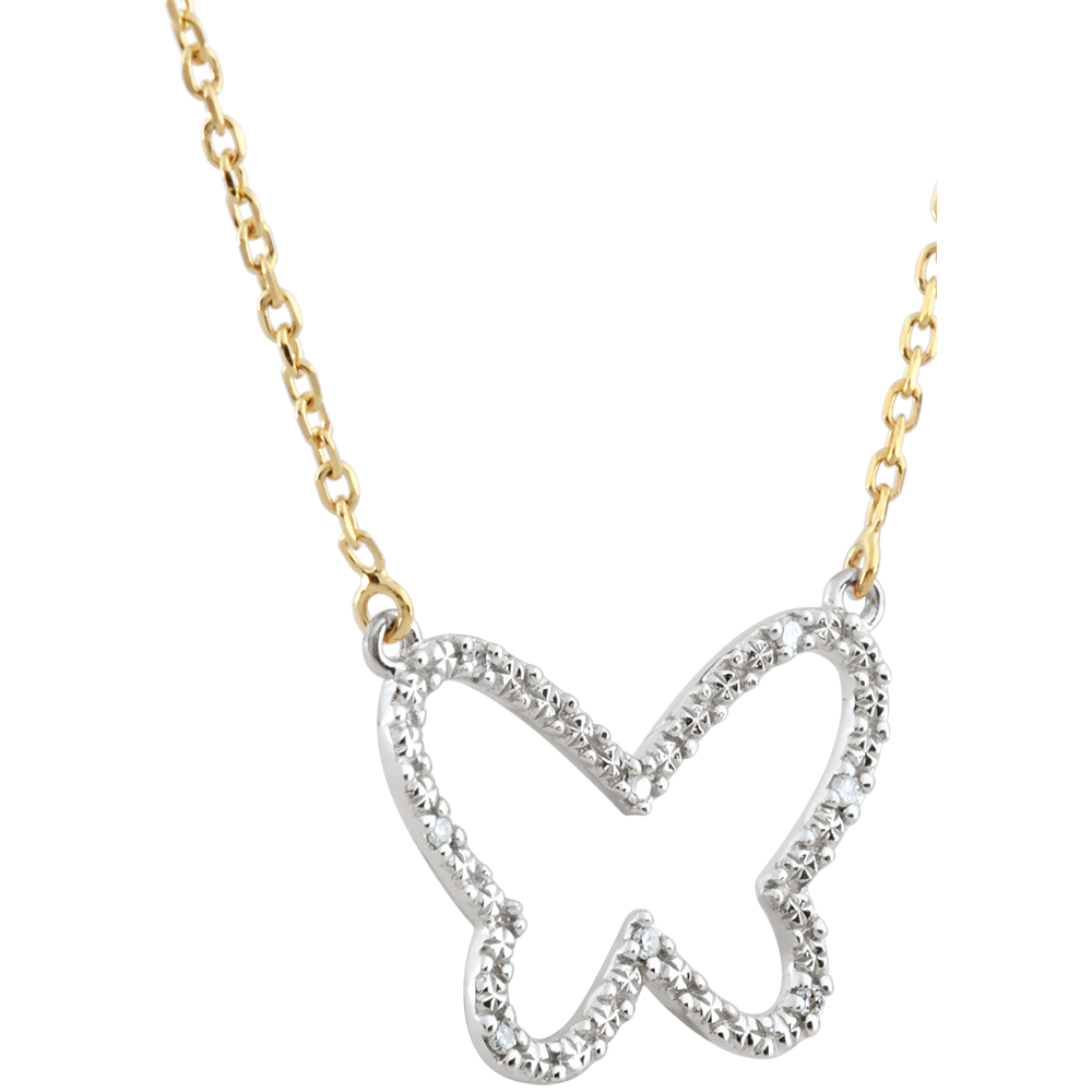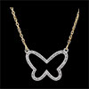 Un fluture din aur şi diamante al cărui contur este desenat la capătul unui lanţ de aur.
