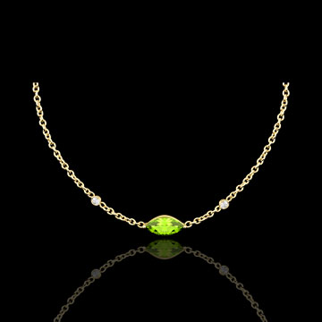 Preţioasa pupilă simbolizată de un peridot tăiat marquise domină în centrul acestui lanţ fin de aur galben. Ea este înconjurată de două minunate diamante asemănătoare a două lacrimi îngheţate pentru totdeauna.