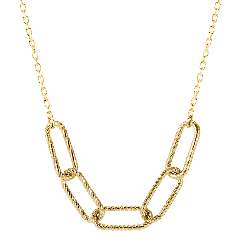Cinci zale din aur galben ușor răsucite se leagănă pe un lanț delicat. Un colier modern și feminin. Lanț cu lungimea de 45cm și inel de reglare la 42cm..