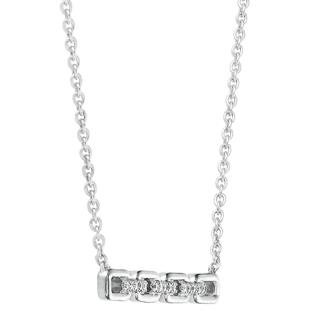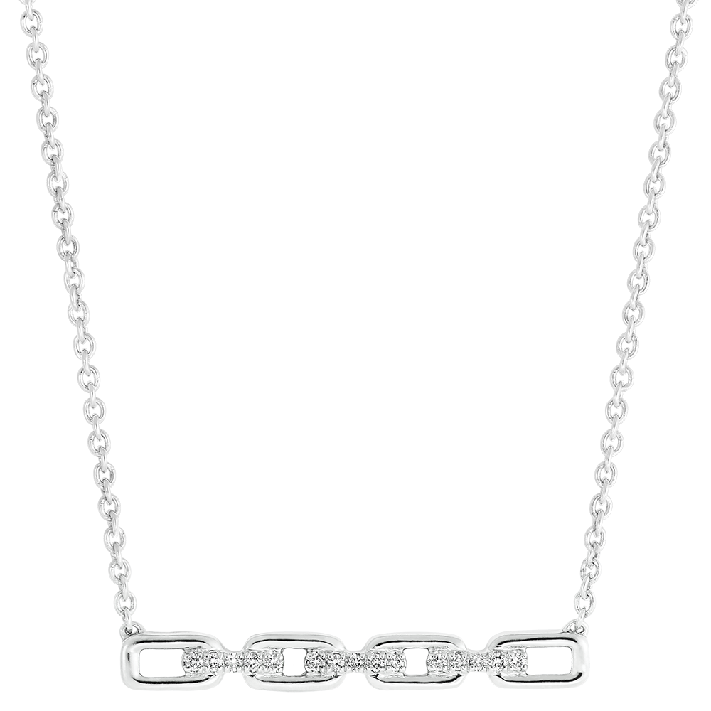 Patru zale cubaneze generoase încrustate cu diamante contrastează cu un lanț delicat într- un colier clasic din aur alb revizuit. Lanț cu lungimea de 45cm și inel de reglare la 42cm.