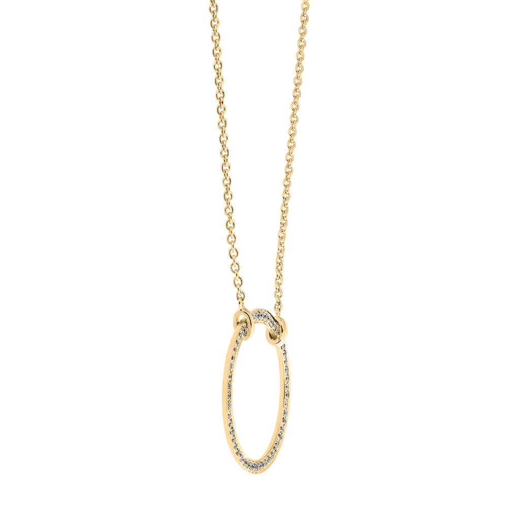 Un cerc delicat din aur galben subliniat de un pavaj cu diamante. Un clasic revizuit.Lanț cu lungime de 45cm și inel de reglare la 42 cm.