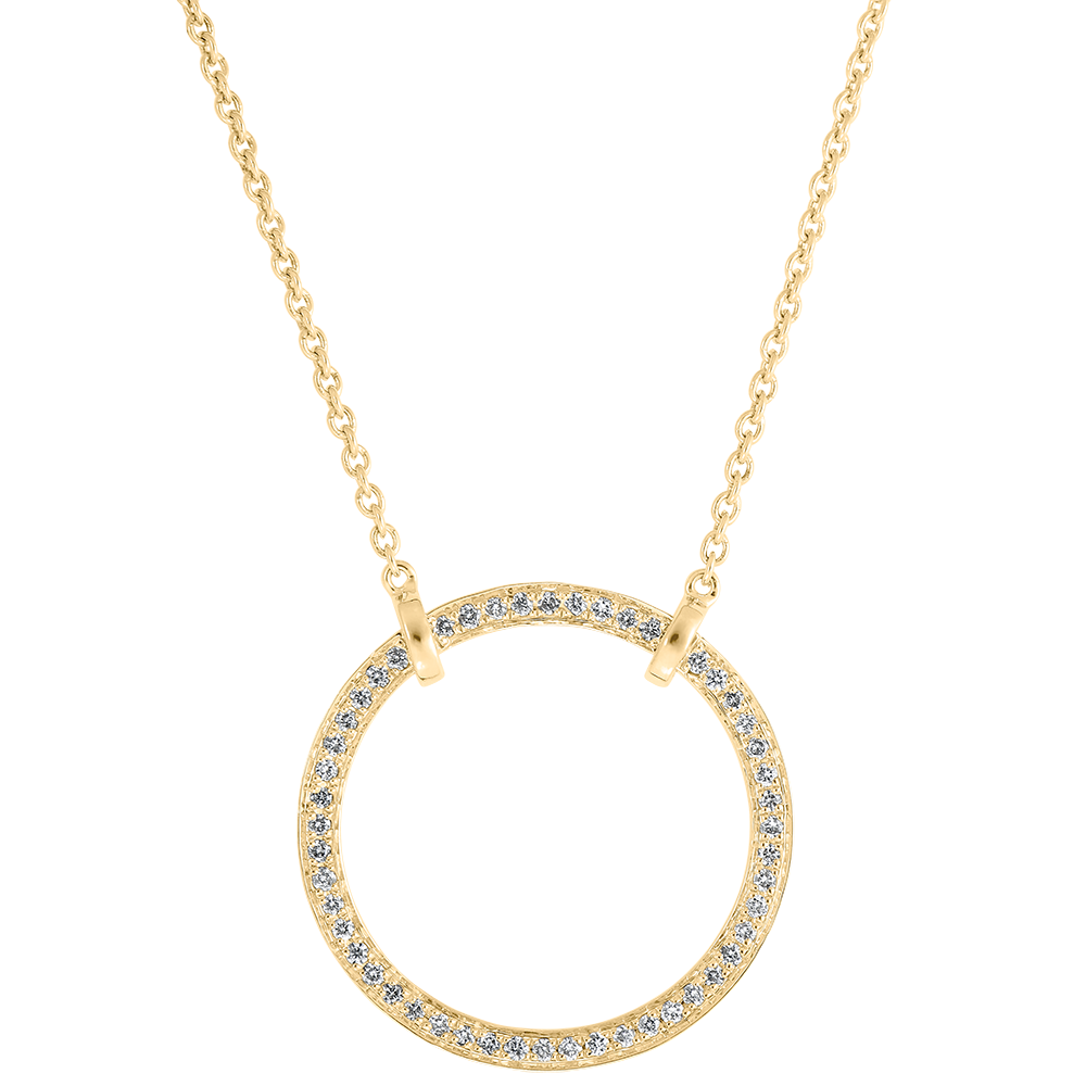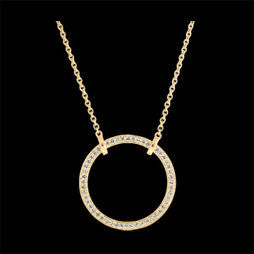 Un cerc delicat din aur galben subliniat de un pavaj cu diamante. Un clasic revizuit.Lanț cu lungime de 45cm și inel de reglare la 42 cm.