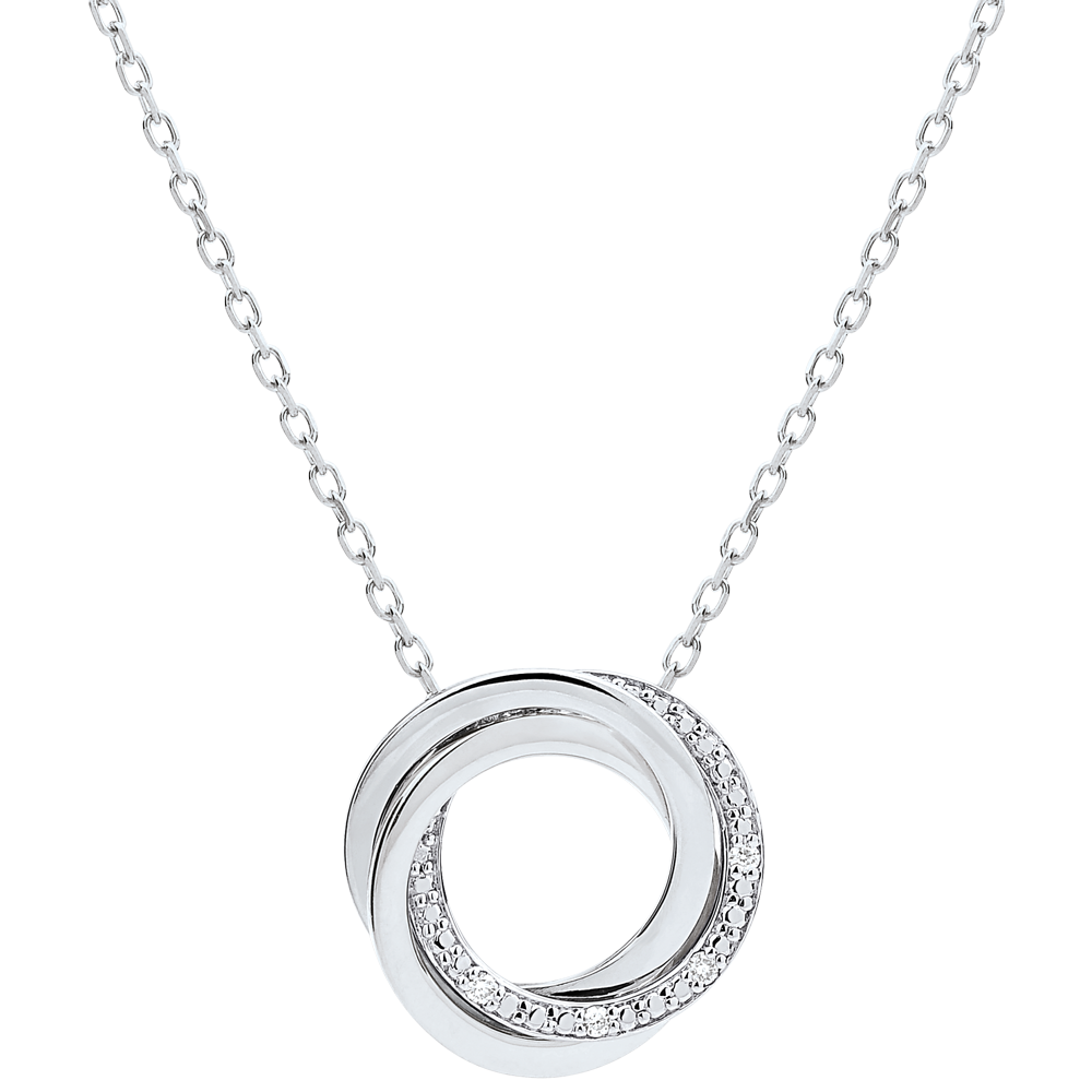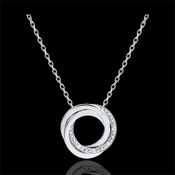 Uniunea echilibrată a trei inele, subliniată de un pavaj de diamante în aurul alb crează acest colier excepţional.