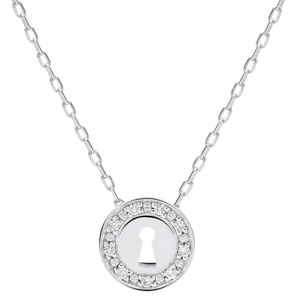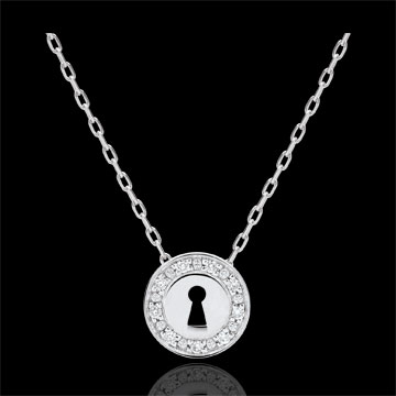 Un colier inimă din aur alb ce poartă o încuietoare este fixat pe un lanţ din aur alb împodobit cu două briliante.