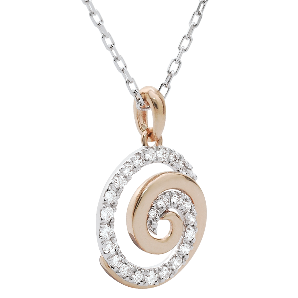 O spirală preţioasă de aur roz şi diamante suspendată pe un lanţ din aur alb.