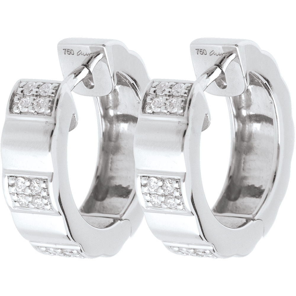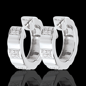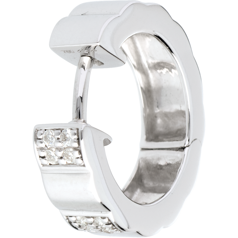 Inele cu contur arcuit, subliniate de rânduri de diamante, într-o pereche de creole subtile şi distinse.